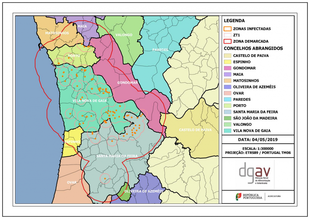 A 3 de Janeiro de 2019 foi confirmada a presença da bactéria Xylella fastidiosa em Portugal, numa sebe ornamental de Lavandula dentata presente no jardim do Zoo de Santo Inácio, em Vila Nova de Gaia, na sequência da colheita de uma amostra, no âmbito do Programa de Prospecção Nacional levado a cabo pelos serviços oficiais.