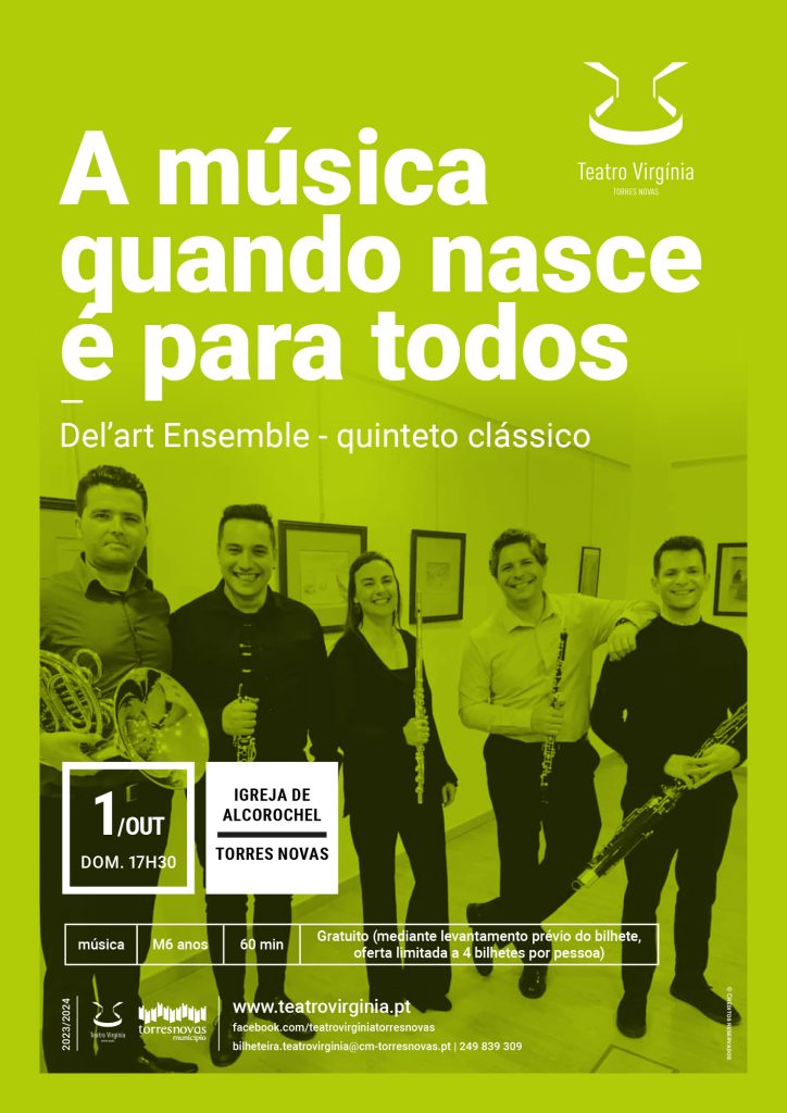 O conjunto Del’art Ensemble leva «A Música quando nasce é para todos» à Igreja de Alcorochel no próximo domingo, dia 1 de outubro, a partir das 17h30. A entrada é gratuita, mediante levantamento prévio de bilhete na bilheteira do Teatro Virgínia ou, no local do espetáculo, duas horas antes do mesmo.