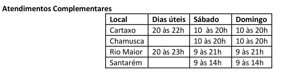 Para além destas medidas de aumento da disponibilidade de atendimentos, o ACES informa ainda, que conta com o funcionamento dos seguintes serviços de atendimento complementar (AC), que permitem assim dispor de atendimento nos sete dias da semana para além de alargamento diário, nalguns casos, considerando que as unidades garantem o funcionamento nos dias úteis, na generalidade, entre as 8 e as 20 horas: