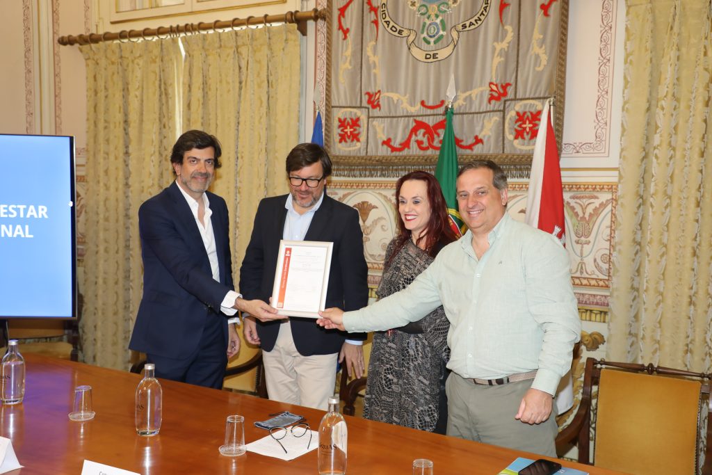 A sessão solene de entrega teve lugar esta terça-feira, dia 23 de abril, pelas 11 horas, no Salão Nobre da Câmara Municipal de Santarém, na presença do Presidente da Câmara Municipal de Santarém, Ricardo Gonçalves, do Presidente do Conselho de Administração da empresa municipal Águas de Santarém e da Coordenadora do Departamento de Certificação, Carla Lima.
