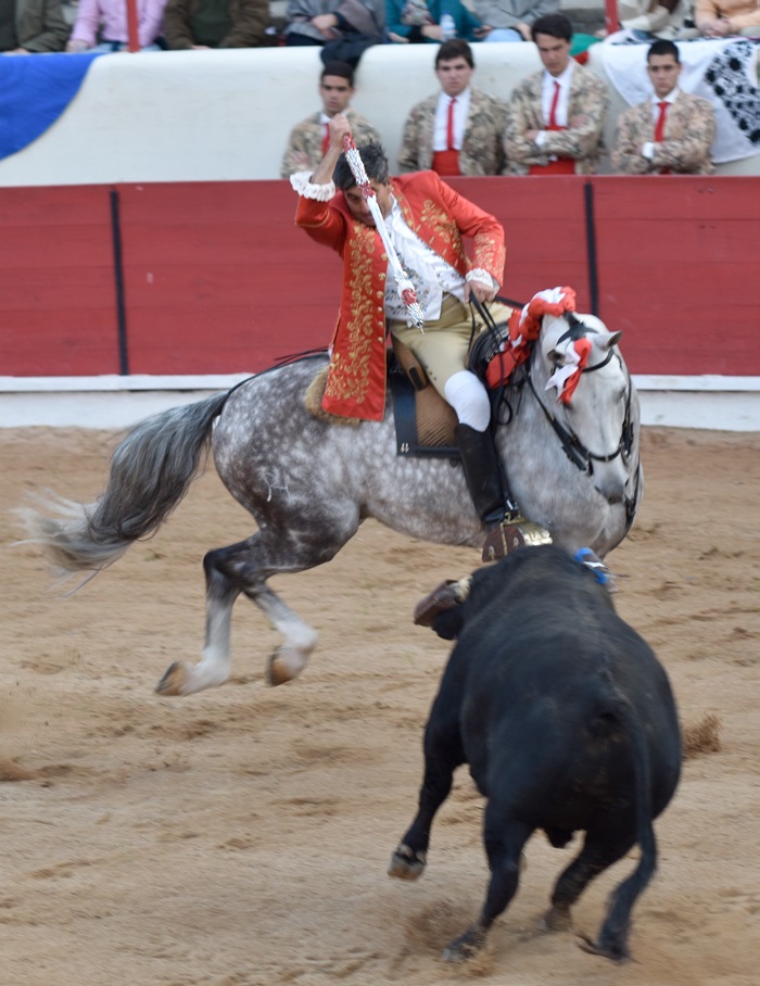O jovem António Ribeiro Telles (Filho) assumiu nesta tarde um tremendo desafio, mas, como se compreenderá, se não se sentisse confortável e convicto das suas capacidades não teria aceitado o prestigiante convite. Em boa verdade o jovem marialva da Torrinha desenvolveu um toureio tecnicamente perfeito, em todos os momentos de cada lide. Após receber correctamente os seus oponentes, colocou certeira a ferragem comprida, rematando adequadamente cada sorte. Com os curtos teve o mérito de eleger os melhores terrenos e, desenhando bem cada sorte, desincumbiu-se galhardamente da ferragem, privilegiando as sortes frontais, concedendo a primazia de investida aos seus oponentes e colocando a ferragem de alto a baixo, como mandam os cânones do toureio equestre. Impressionou pela maneira segura e elegante como se placeou em todos os terrenos, conquistando o respeitável que lhe tributou as mais calorosas ovações da tarde. E convirá dizer, porque não é coisa de somenos, que o lote que lhe coube enfrentar não era nada fácil, mas o jovem marialva apresentou as credenciais e passou com muita distinção nesta prova de fogo.