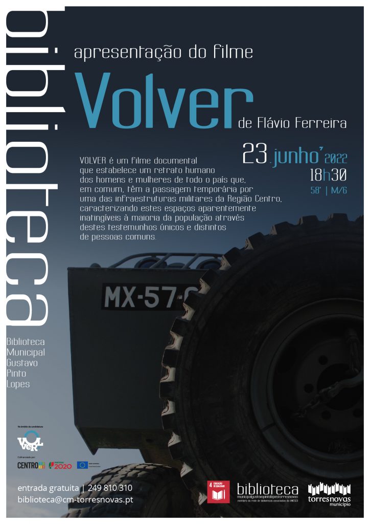 No próximo dia 23 de Junho, quinta-feira, a partir das 18h30, a Biblioteca Municipal Gustavo Pinto Lopes acolhe a apresentação do filme «Volver», do jovem realizador torrejano Flávio Ferreira. Este filme resulta de uma candidatura ao programa VOLver, cofinanciado pelo Programa Operacional Regional do Centro 2020. A entrada é gratuita.