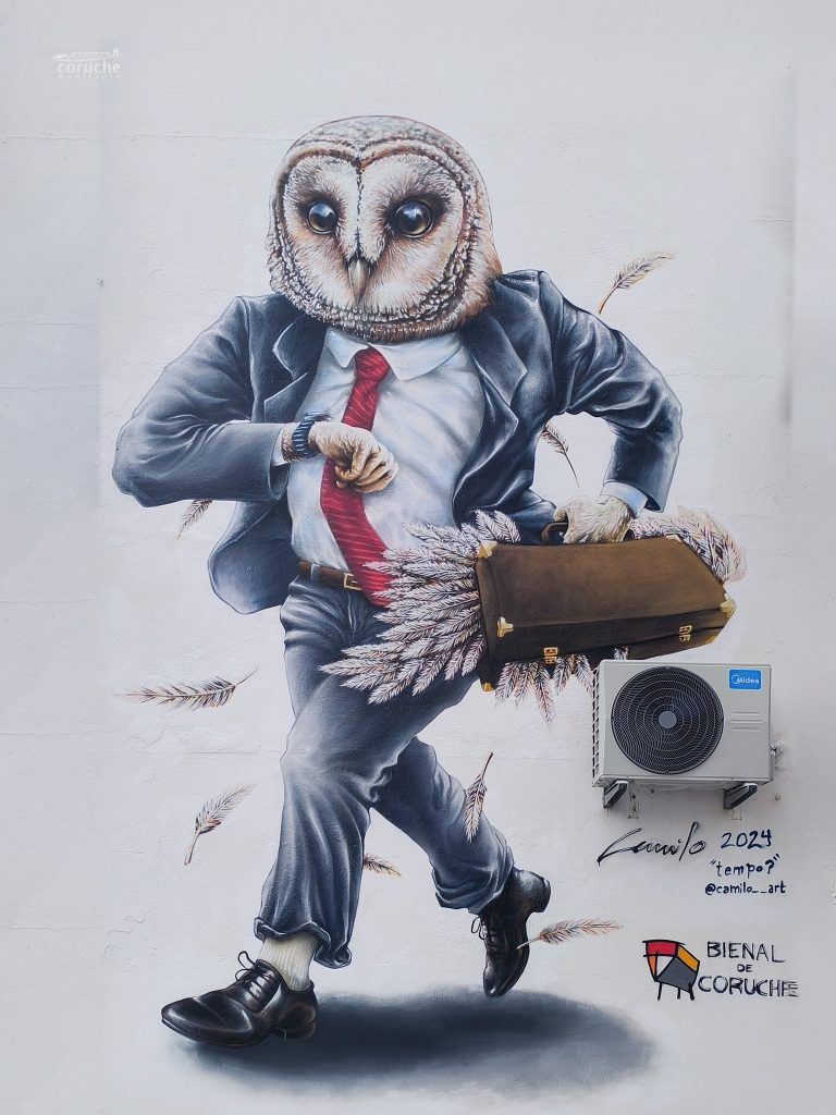 Na EPC nasceu a imagem impactante de um homem-coruja que vai sem tempo. «Uma sátira da intenção sobre a possibilidade?», questiona o autor, que assume «uma homenagem a todos os que trabalham diária e honestamente pelos seus objetivos». A obra provoca uma reflexão sobre o ritmo frenético da vida moderna. Materiais usados: spray, tintas de parede e verniz.