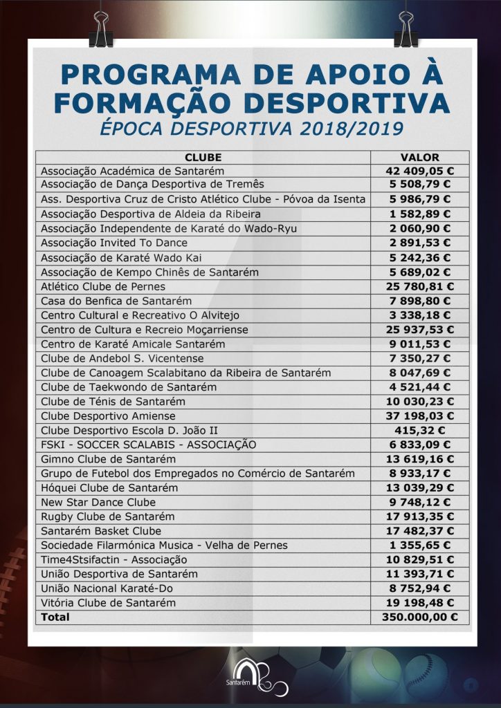 A Câmara Municipal de Santarém vai distribuir um apoio de 350 mil euros aos clubes do concelho. A proposta foi aprovada em Reunião do Executivo na passada segunda-feira, dia 6 de Maio.