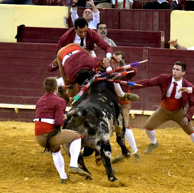 Para as pegas perfilaram-se dois Grupos com pergaminhos: Amadores de Montemor e de Évora, estes a comemorar 60 anos de existência. Noite dura, mas de grande valor pela estoicidade dos forcados da cara e das “ajudas” e porque, efectivamente, houve pegas do outro mundo, com uma raça e um valor dignos dos maiores de todos os tempos. Por Montemor abriu praça Francisco Maria Borges, numa colossal pega à segunda tentativa, suportando fortes derrotes do imponente “Murteira” em ambas as tentativas e com grande primeira ajuda do seu Cabo, António Pena Monteiro, com quem daria volta no final; Vasco Ponce esteve enorme, consumou rija cara ao primeiro intento, assim como José Maria Pena Monteiro. Os Amadores de Évora tiveram na cara do segundo da noite o forcado Ricardo Sousa, numa excelente pega ao segundo intento e suportando fortíssimos derrotes, seguido por José Maria Passanha, numa rija cara ao primeiro intento, e com o Cabo José Maria Caeiro a fechar-se com garra e determinação numa grande pega à segunda tentativa. Honra e glória às jaquetas alentejanas de Montemor e de Évora.