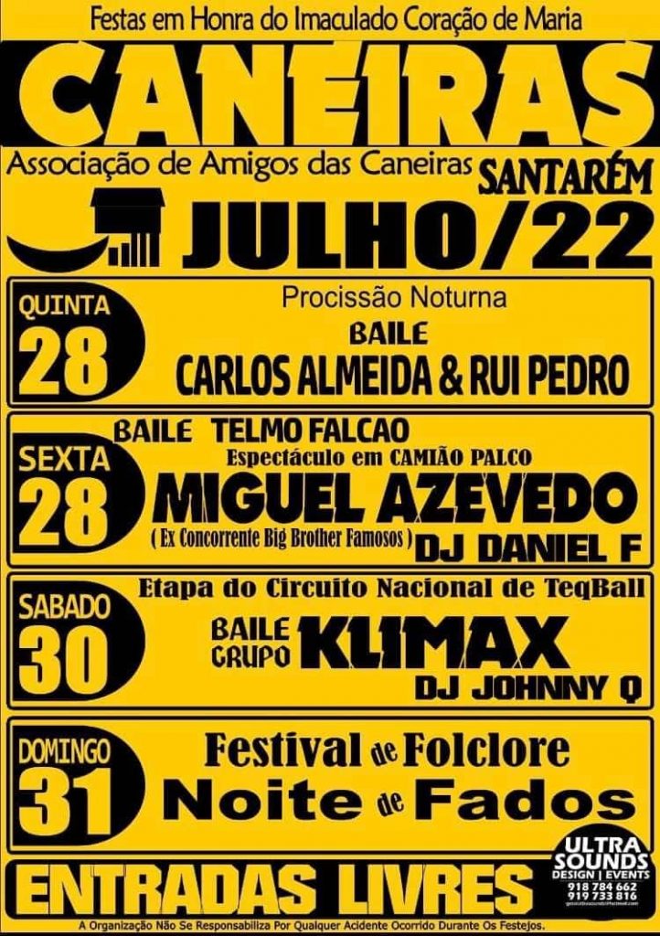 De 28 a 31 de Julho, a aldeia ribeirinha das Caneiras está em festa. Organizadas pela Associação de Amigos das Caneiras, as festividades em honra do Imaculado Coração de Maria incluem música, desporto, uma procissão nocturna, um festival de folclore e uma noite de fados, para além de um conjunto de actividades para toda a família.