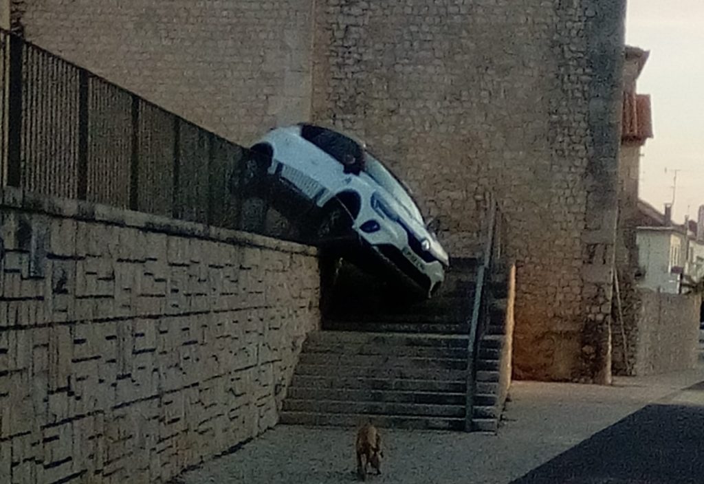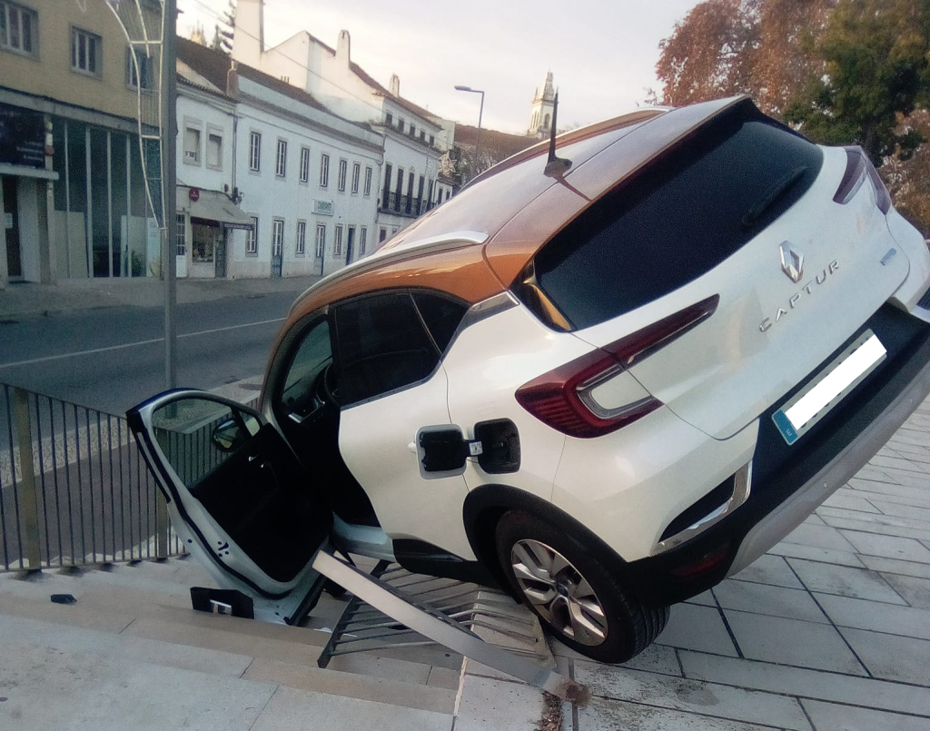 Um veículo ligeiro de passageiros foi encontrado suspenso no gradeamento da escadaria do Convento de São Francisco na manhã deste domingo, 19 de Dezembro, em Santarém.