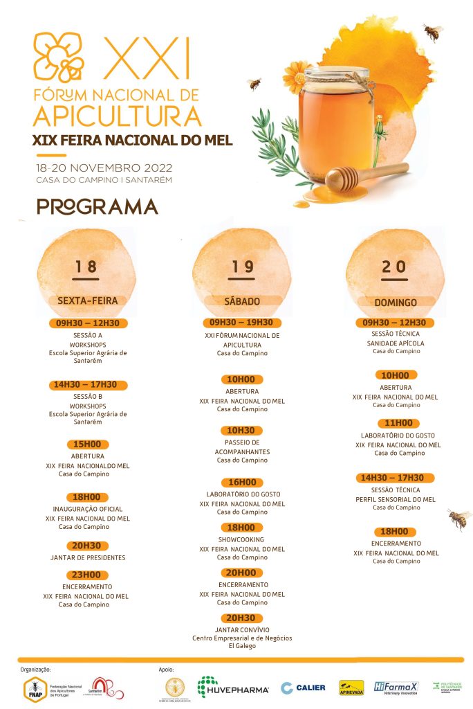 O programa da Feira Nacional do Mel conta com workshops de formação dedicados e dirigidos aos ativos do setor apícola nacional, laboratórios do gosto, showcooking, sessões técnicas, e várias atividades de divulgação dos produtos, materiais e equipamentos.