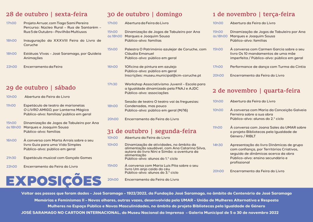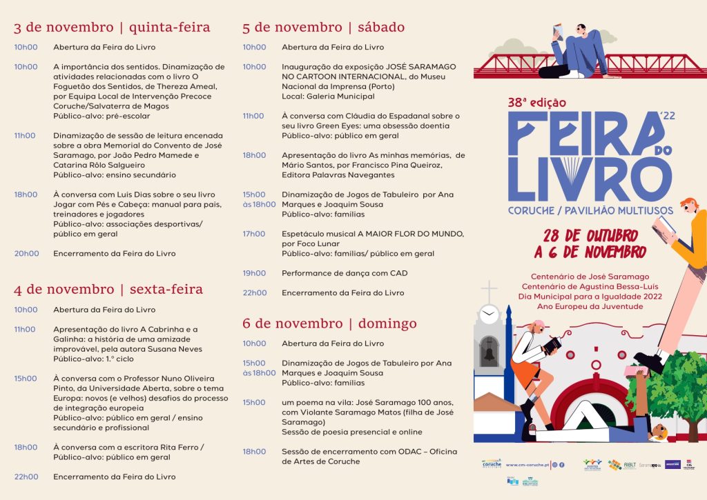 O Pavilhão Multiúsos de Coruche recebe, de 28 de Outubro a 06 de Novembro, a 38.ª Feira do Livro, que terá em destaque eventos que assinalam os centenários de José Saramago e de Agustina Bessa Luís.