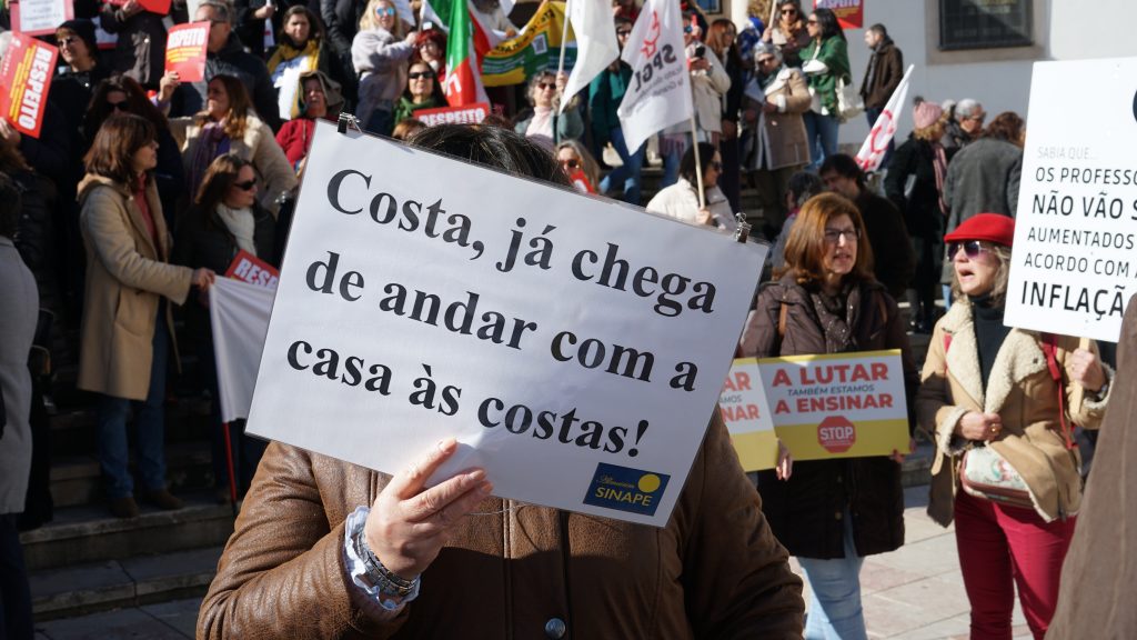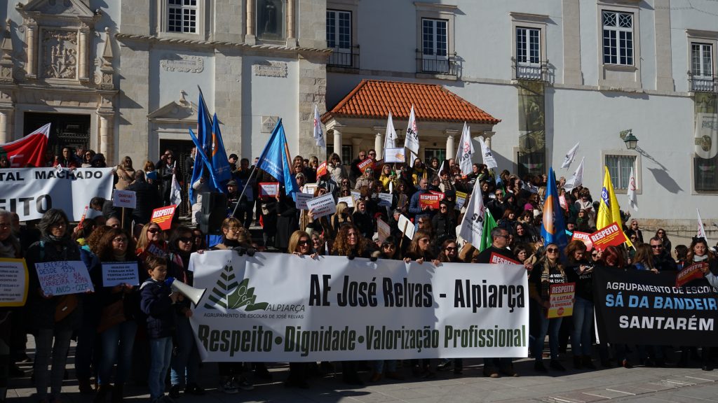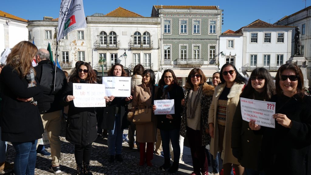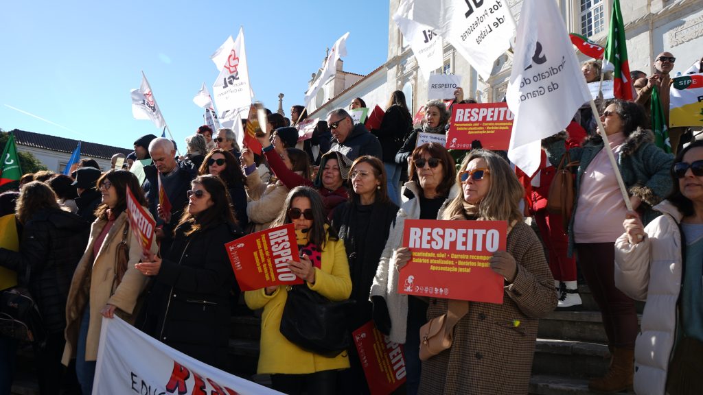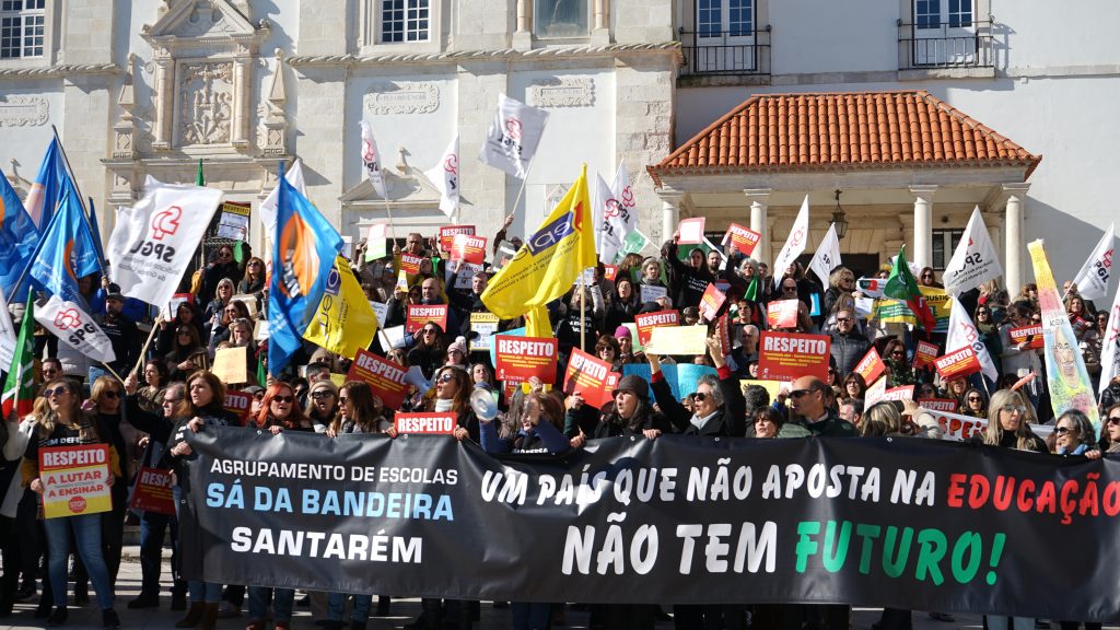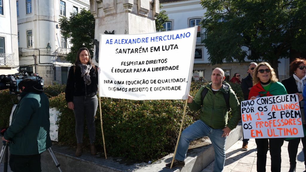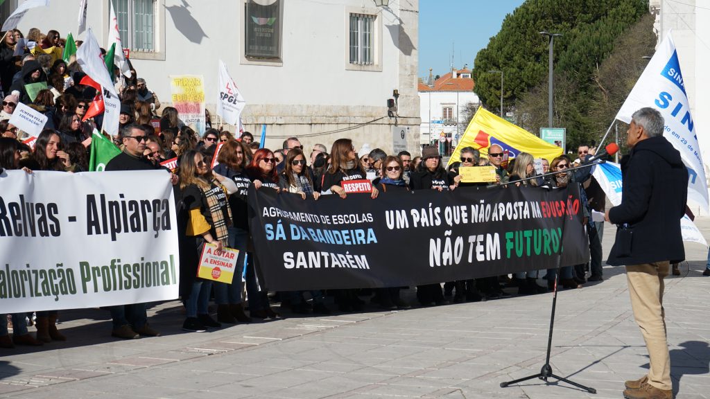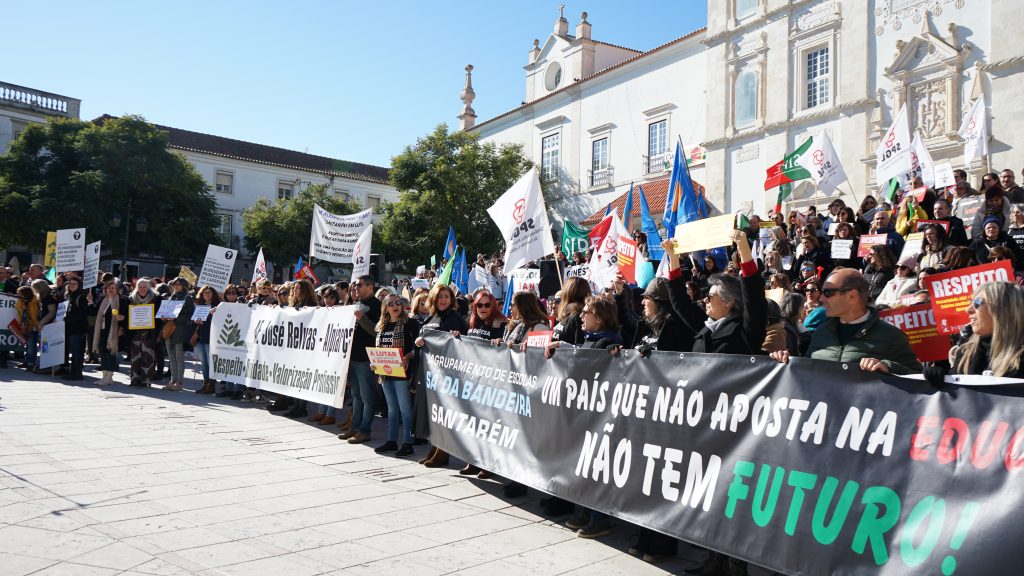 Centenas de professores concentraram-se esta quarta-feira, 1 de Fevereiro, em Santarém, no Largo do Seminário, para reafirmarem palavras de ordem que se têm ouvido em todo o país, como “respeito”, “não paramos” ou, ainda, “Costa, escuta, a escola está em luta”.