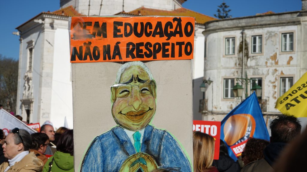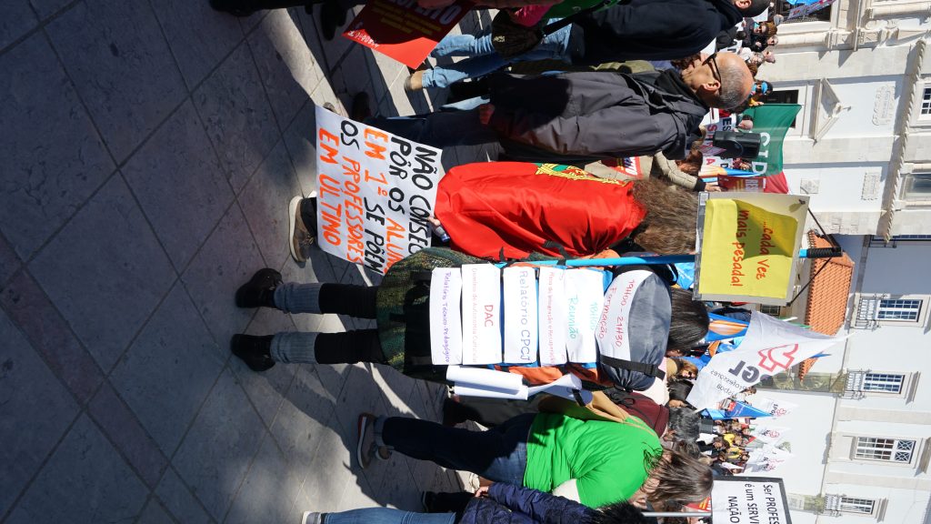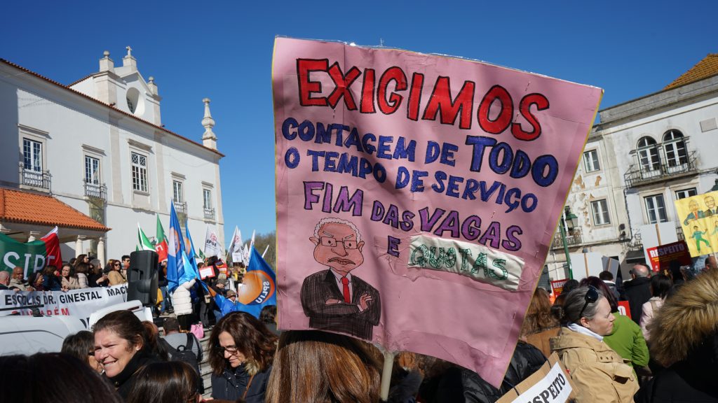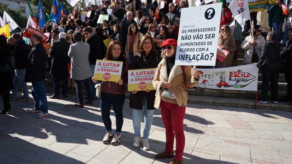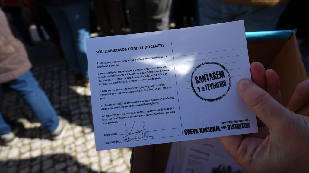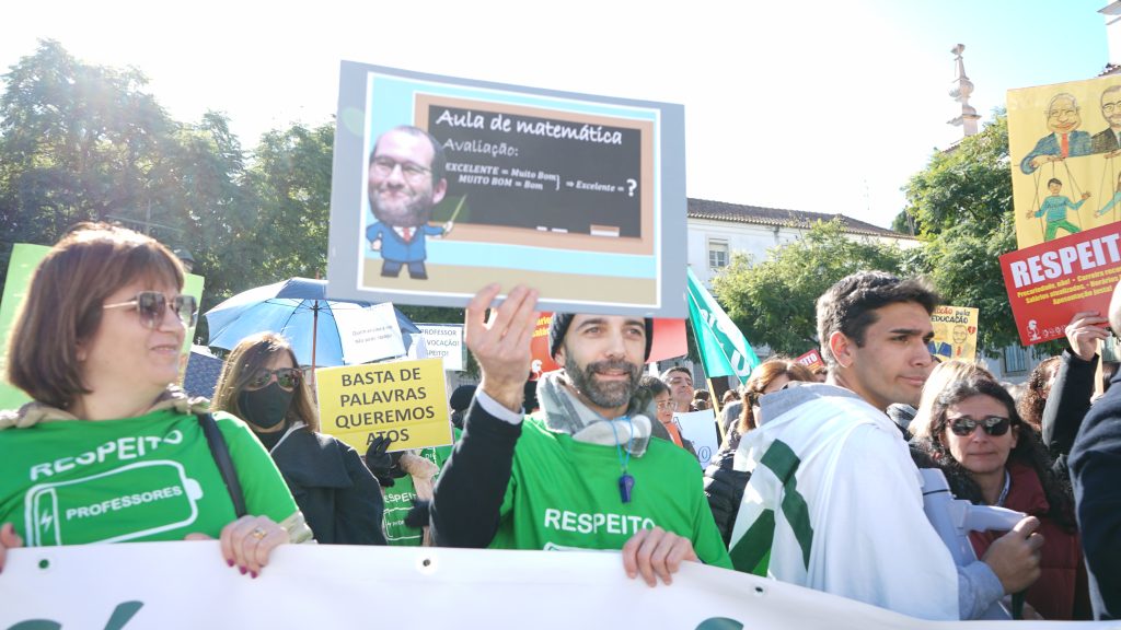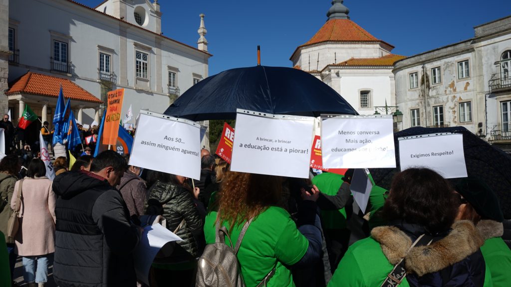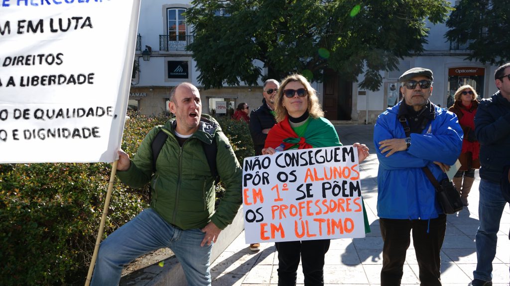 Centenas de professores concentraram-se esta quarta-feira, 1 de Fevereiro, em Santarém, no Largo do Seminário, para reafirmarem palavras de ordem que se têm ouvido em todo o país, como “respeito”, “não paramos” ou, ainda, “Costa, escuta, a escola está em luta”.