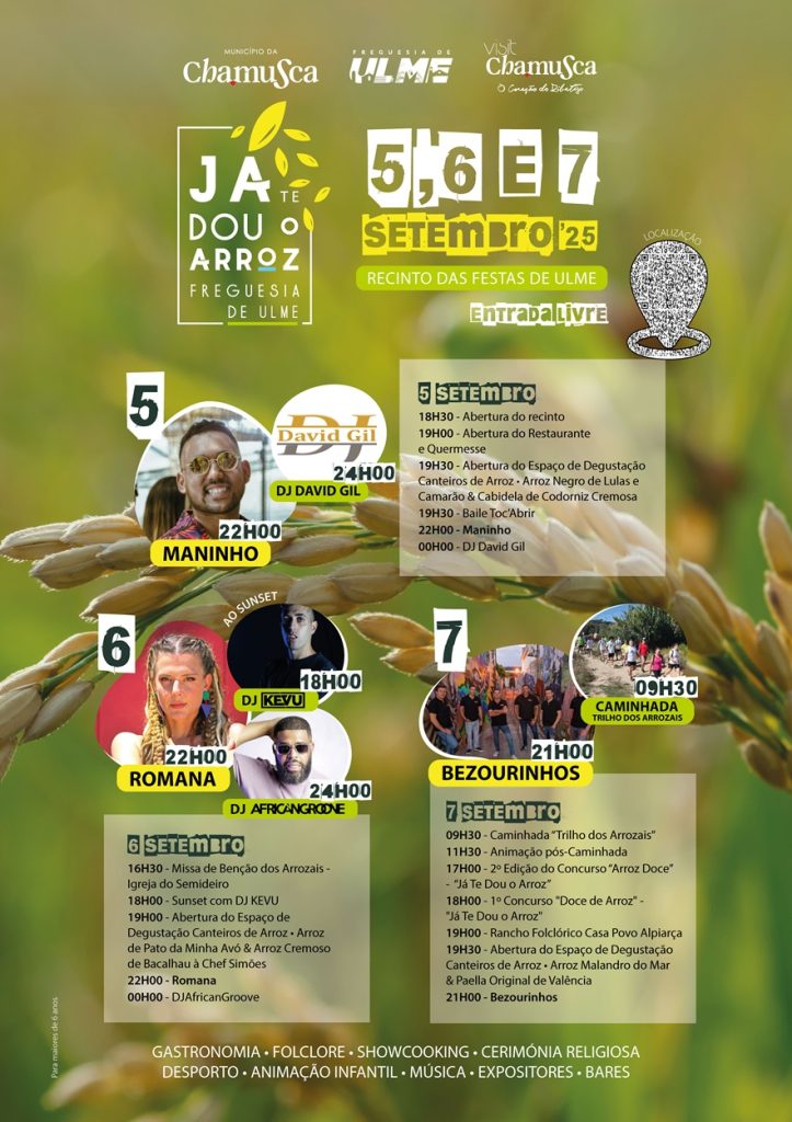O Festival ‘Já te Dou o Arroz’ dedica-se inteiramente à valorização do arroz, produto endógeno e um dos maiores tesouros da freguesia de Ulme, onde “este cereal vai muito para além de um simples ingrediente: é uma fonte de riqueza e sustento para muitas famílias.”, defende o município.