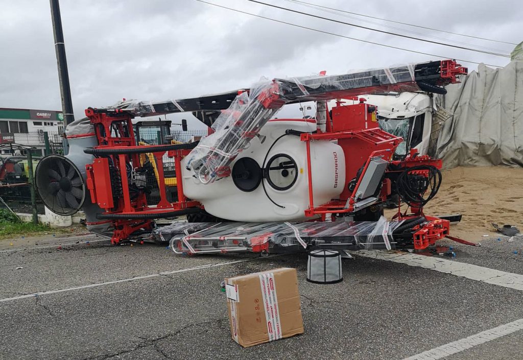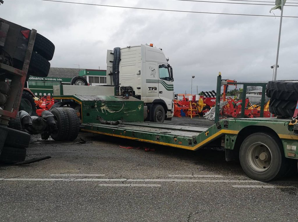 Um dos pesados transportava um máquina agrícola e o outro pesado envolvido seguia com uma carga de areia, sendo que ambas ficaram espalhadas pela faixa de rodagem.
