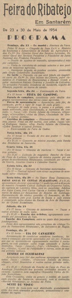 Depois, não faltarão quadros típicos, sempre do agrado popular, qual é a exibição de ranchos folclóricos, do Cartaxo e Azinhaga, marchas, fandanguistas, gincanas de automóveis e tractores, corrida de campinos e o mais que consta do programa.