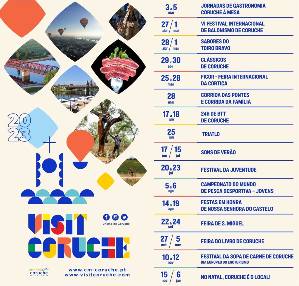 O Município de Coruche apresenta oficialmente o seu cartaz de eventos para 2023 na Bolsa de Turismo de Lisboa (BTL), a decorrer na FIL – Parque das Nações, em Lisboa, de 1 a 5 de Março. Em comunicado, o município revela que “a agenda revela um cartaz cultural e desportivo inspirado pelo montado e pela lezíria; pelos sabores harmonizados de um destino gastronómico de rotas enoturísticas; pela emoção dos concertos e das festas à beira-rio; pela paisagem próspera e deslumbrante, sobrevoada em balão de ar quente, ou pela adrenalina do curso do Sorraia e dos trilhos de corrida e BTT. Coruche é cultura, futuro e tradição. Coruche é Paz e aventura. Coruche Inspira”.