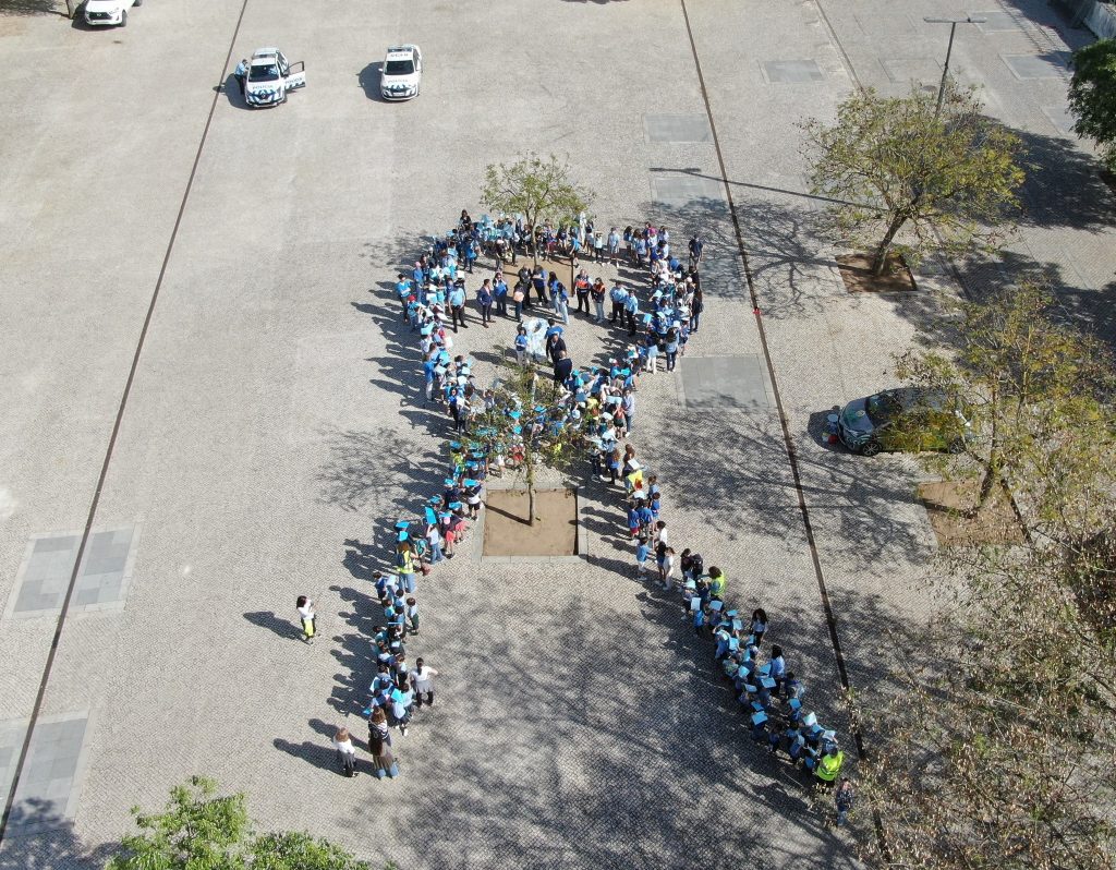 O término do Mês da Prevenção dos Maus Tratos na Infância ficou também marcado pela construção de um laço azul humano pelas crianças no Jardim da Liberdade.