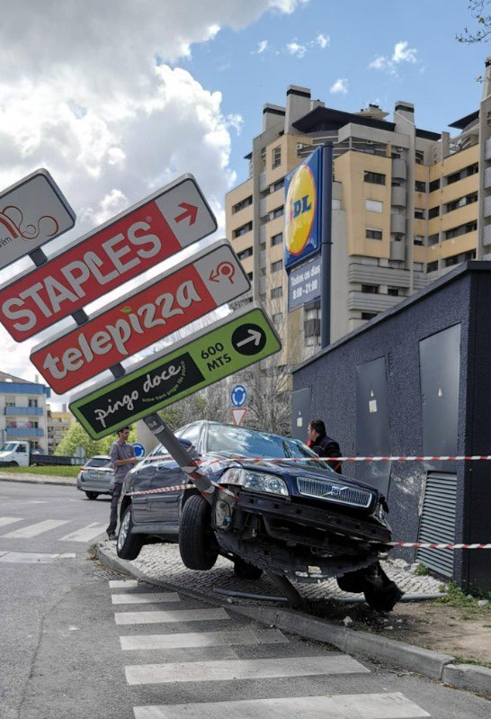 Um acidente algo caricato provocou dois feridos na tarde desta quarta-feira, 27 de Abril, na rotunda de S. Domingos, em Santarém.