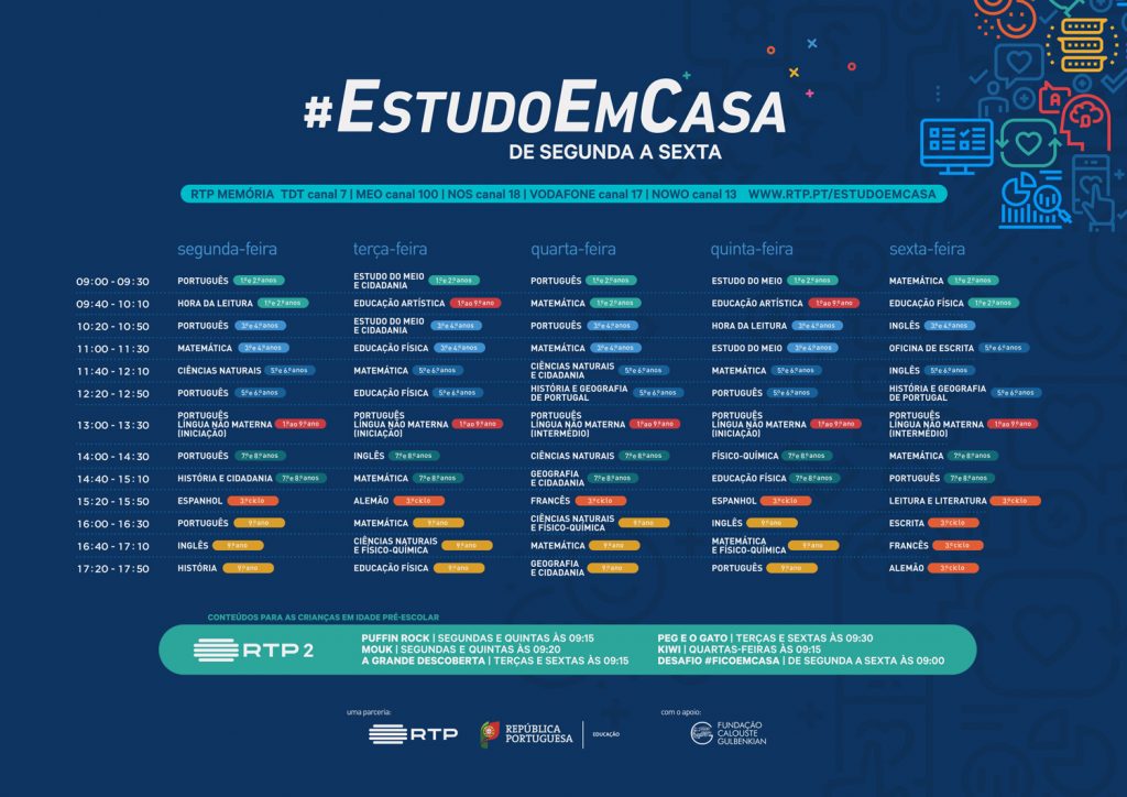 O Ministério da Educação divulgou a grelha do espaço #EstudoEmCasa, que vai ocupar parte da programação da RTP Memória durante o terceiro período, das 09h00 às 17h50 com aulas para o 1.º e 2.º ciclos de manhã e para o 3.º ciclo à tarde.