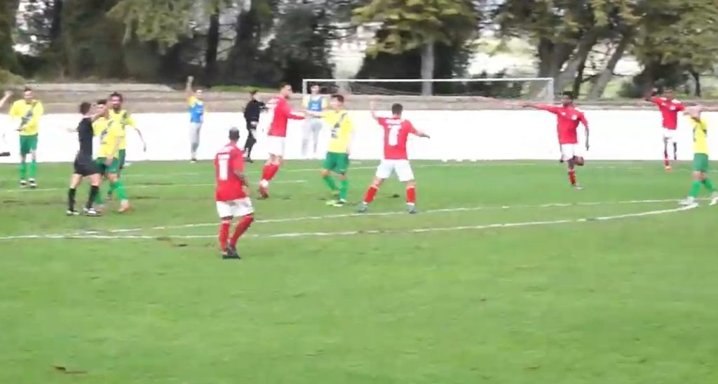 Toda a equipa visitante pediu falta sobre o guarda-redes mas o árbitro da AF Coimbra apontou o centro do terreno e validou o golo do empate.