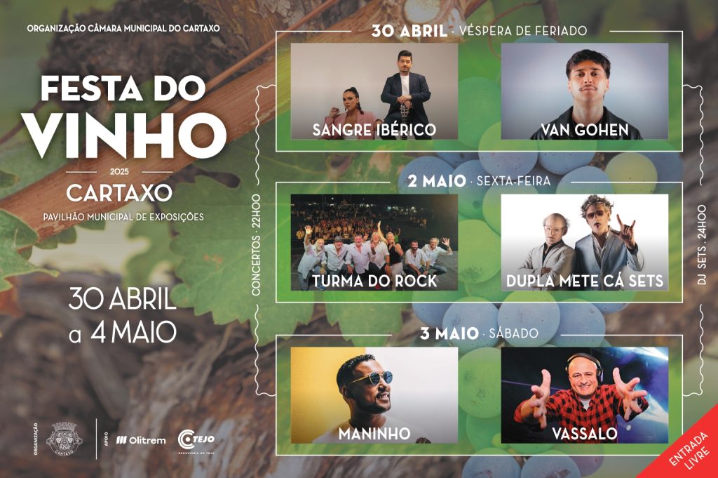 Exposição, venda e provas de vinho, cozinha ao vivo e harmonizações para descobrir ligações de excelência entre vinho e gastronomia. O melhor das casas agrícolas, das adegas e das empresas do setor vitivinícola. O artesanato, o folclore e a música tradicional, os grandes concertos e os Dj Set para dançar pela noite dentro. As tasquinhas regionais para descobrir iguarias e brindar com os amigos. São estas as propostas da Festa do Vinho do Cartaxo 2025 que o presidente da Câmara Municipal do Cartaxo inaugurou ontem, dia 30 de abril, pelas 19h00.
