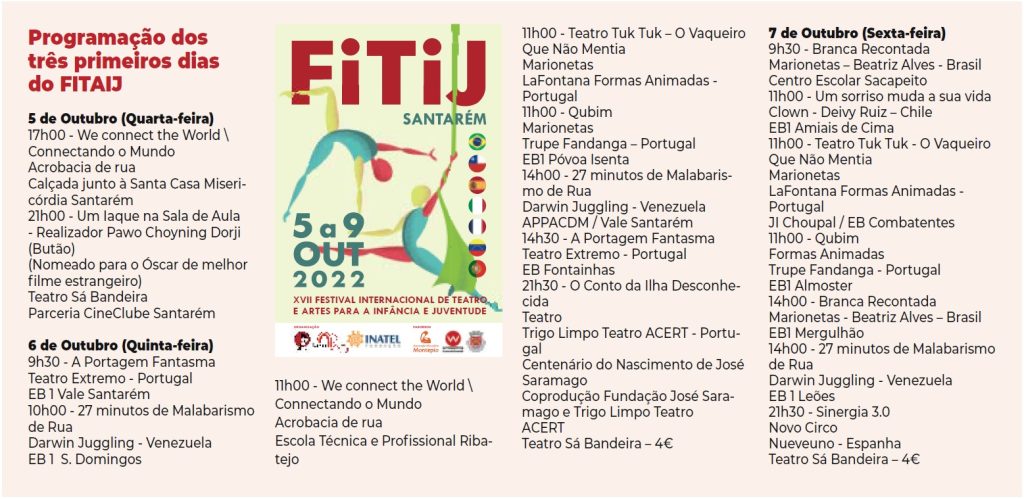 A 17ª edição do FITIJ/FITAIJ – Festival Internacional de Teatro e Artes para a Infância e Juventude realiza-se de 05 a 09 de Outubro em Santarém. Grupos artísticos de sete países da América do Sul e da Europa – Brasil, Chile, Espanha, França, Itália, Venezuela e Portugal – deixam a sua marca pelos palcos e pelos espaços não convencionais do concelho, incluindo as suas escolas.