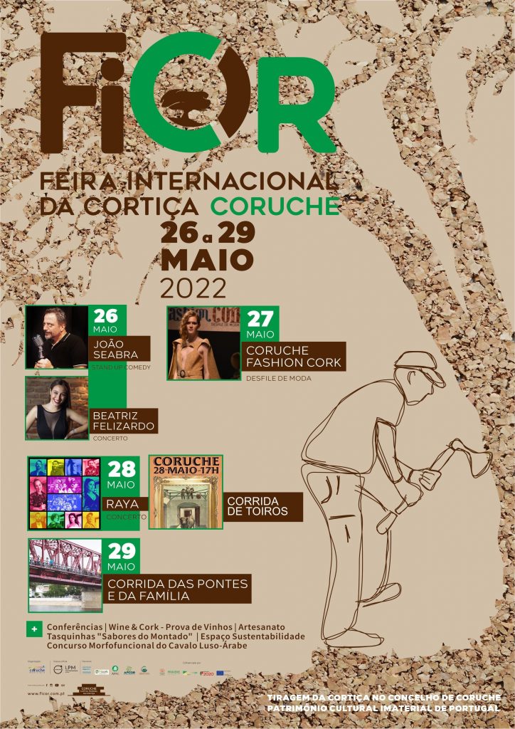 Volvidos dois anos em modelo limitado pela pandemia e após o importante reconhecimento da Tiragem da Cortiça enquanto Património Cultural Imaterial de Portugal, a FICOR – Feira Internacional da Cortiça regressa mais forte, de 26 a 29 de Maio de 2022, ao pleno formato presencial de conferências e debates, desfiles de moda, concertos, espectáculos de stand-up comedy, provas de vinho e espaços especialmente dedicados à gastronomia. Além do desfile de moda Coruche Fashion Cork, este ano apresentado por Isabel Angelino, no qual serão dados a conhecer os projectos e as ideias candidatas à V edição do Concurso de Ideias e Criatividade, a FICOR e o Município prometem ainda momentos de evasão e desportivos como a Corrida das Pontes e da Família ou o I Concurso Morfofuncional do Cavalo Luso-Árabe, não esquecendo uma grandiosa corrida de toiros, lidada mano a mano por Rui Fernandes e João Ribeiro Telles.