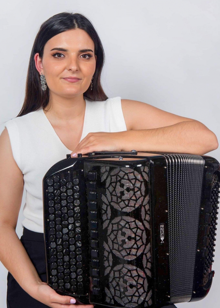 Andreia tem 25 anos e é natural do Cartaxo. Começou a aprender acordeão aos 9 anos de idade na Sociedade Filarmónica Cartaxense. Posteriormente, ingressou no Curso Oficial de Mica no Institute de Mica Vitorino Matono, onde estudou com Acácia Teixeira e Aníbal Freire, o seu actual mestre. É licenciada em Ciências Musicals e Mestre em Ensino da Educação Musical pela FCSH da Universidade Nova de Lisboa. Actualmente, exerce funções como docente do ensino especializado de Musica no Conservatório de Musica e Artes do Centro e na Academia de Musica de Alcobaça. Em 2016, editou o seu primeiro trabalho discográfico intitulado “Recordações da Nossa Terra”. Desde cedo que participa em diversos festivais de acordeão e em programas de radio e televisão. Como interprete, foi distinguida com vários prémios, destacando-se o 1° lugar no Prémio João Barra Bexiga (Semana Internacional do Acordeão — Alcobaça). Tem impulsionado e organizado as edições anuais do Festival Internacional de Acordeão do Cartaxo, partilhando palco com Petar Maric, Pietro Adragna, Mário Gatto, Eugénia Lima, Tino Costa e Ilda Maria. Lidera o projecto Escolas de Acordeão “Andreia Sofia” que visa promover o acordeão no concelho do Cartaxo e Rio Maior, onde o resultado do seu trabalho tem sido reconhecido através de importantes prémios alcançados pelos seus alunos.