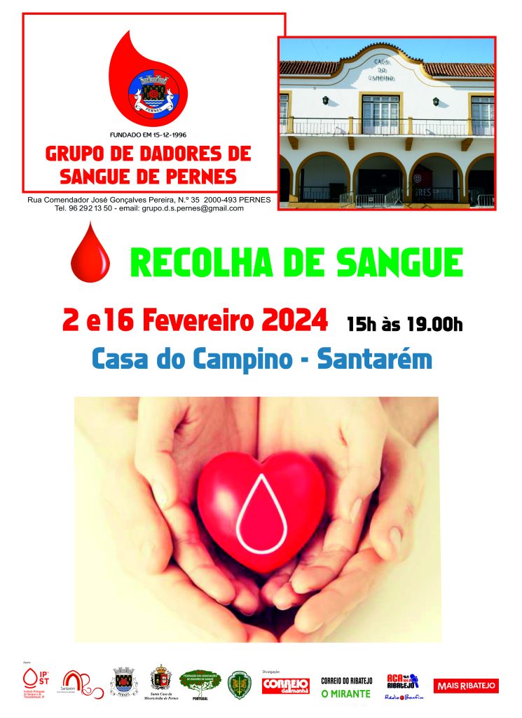 O Grupo de Dadores de Sangue de Pernes vai organizar uma recolha de sangue, nos dias 2 e 16 de Fevereiro, na Casa do Campino, em Santarém, com horário das 15h00 às 19h00.