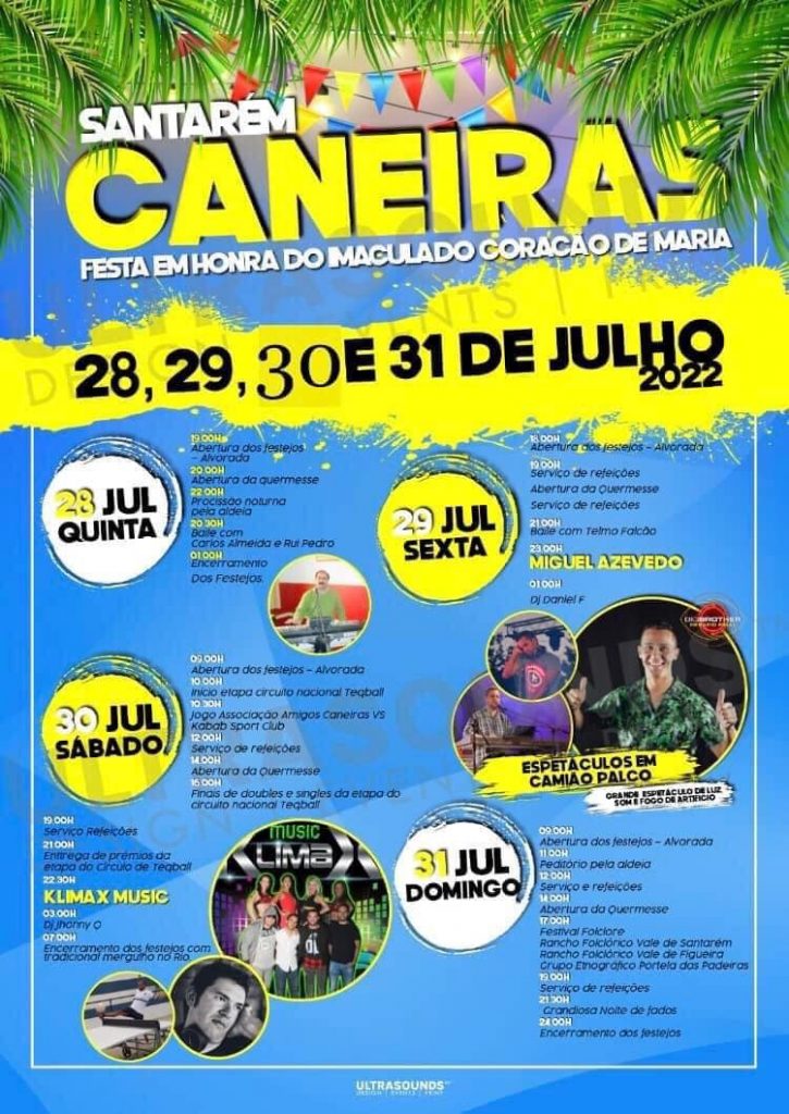Até ao próximo domingo, dia 31 de Julho, a aldeia ribeirinha das Caneiras está em festa. Organizadas pela Associação de Amigos das Caneiras, as festividades em honra do Imaculado Coração de Maria incluem música, desporto, uma procissão nocturna, um festival de folclore e uma noite de fados, para além de um conjunto de actividades para toda a família.