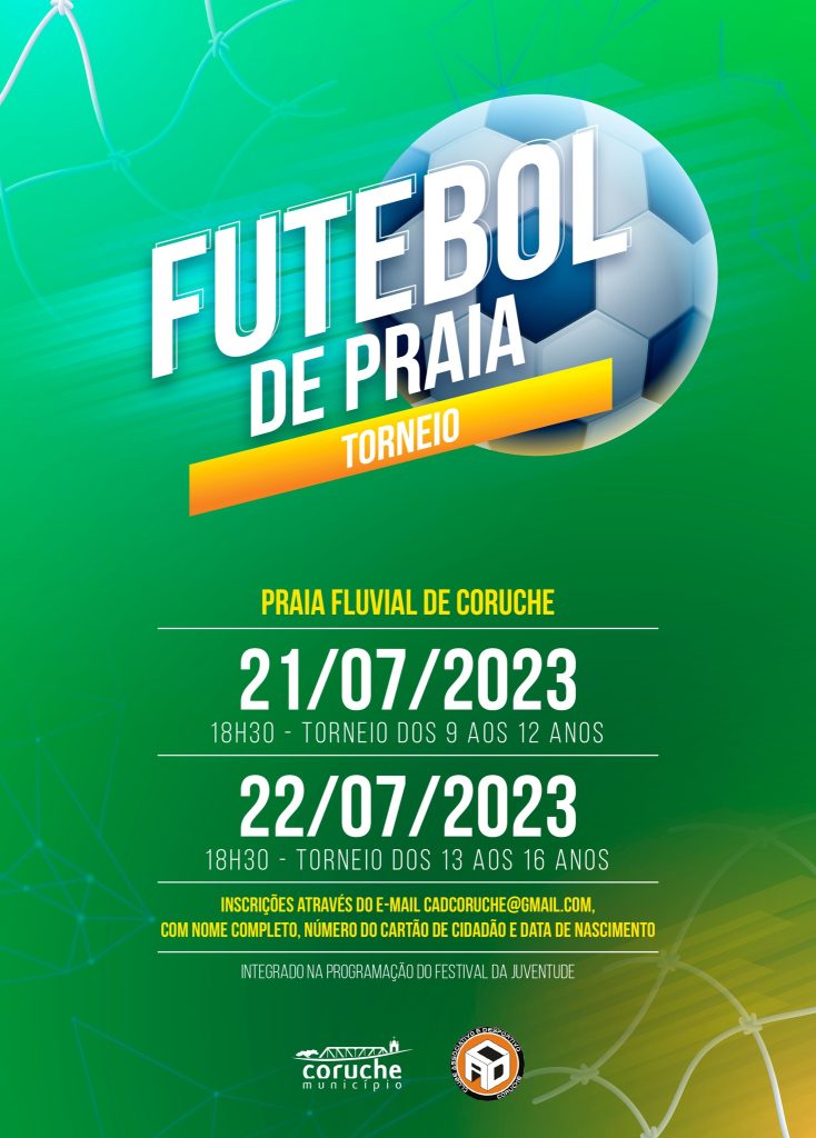 O Município de Coruche vai receber, nos dias 21 e 22 de Julho, um Torneio de Futebol de Praia no âmbito do Festival da Juventude e as inscrições para equipas nos escalões dos 9 aos 12 anos e dos 13 aos 16 anos já se encontram abertas.