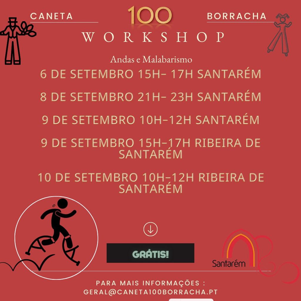 A associação Caneta100Borracha vai promover, de 6 a 10 de Setembro, Workshops de Andas e Malabarismo em Santarém. As inscrições são gratuitas e já se encontram abertas.
