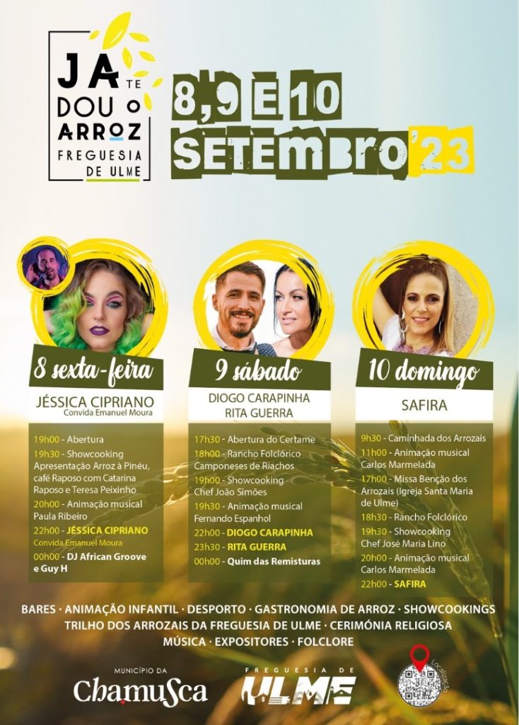 A partir de amanhã, sexta-feira, e até ao dia 10 de Setembro, domingo, a vila de Ulme, no concelho da Chamusca, recebe a terceira edição do festival “Já Te Dou o Arroz”, numa organização conjunta entre a Câmara Municipal da Chamusca e a Junta de Freguesia de Ulme.