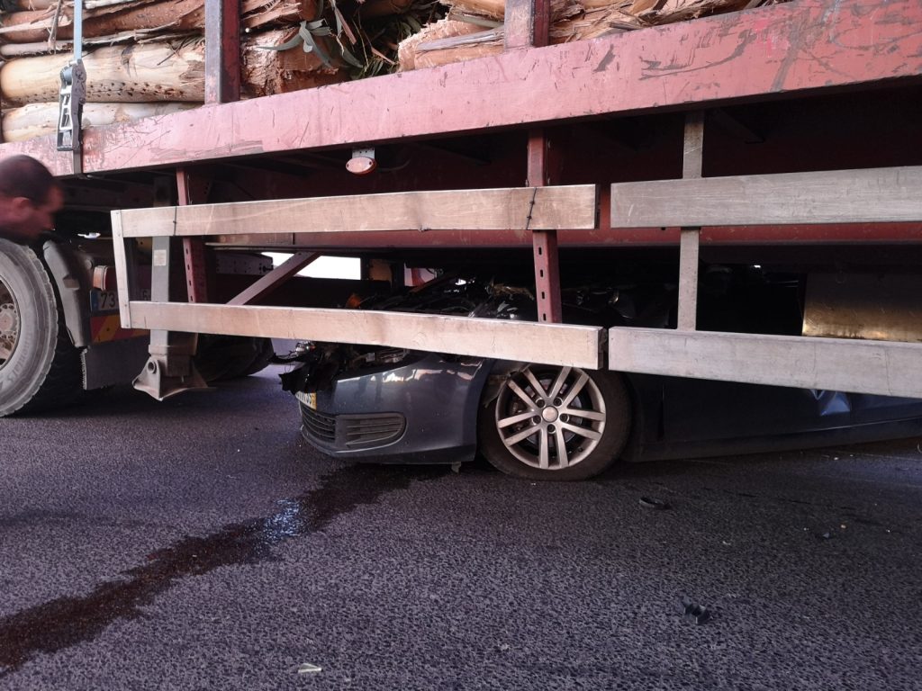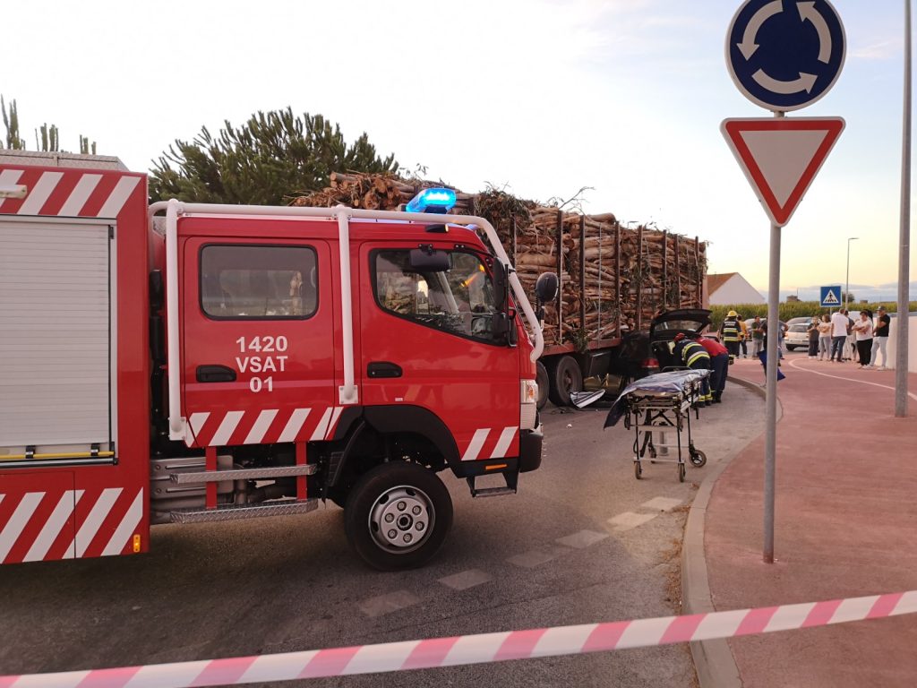 A vítima circulava num veículo ligeiro de passageiros, que acabou por embater na lateral de um pesado de mercadorias de transporte de madeira.