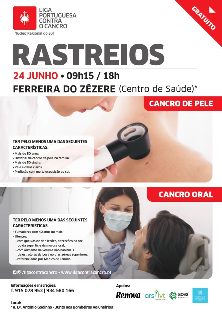 A Liga Portuguesa Contra o Cancro – Núcleo Regional do Sul vai promover no próximo dia 24 de Junho, entre as 09h00 e as 18h00, no Centro de Saúde de Ferreira do Zêzere, rastreios de cancro de pele e de cancro oral.