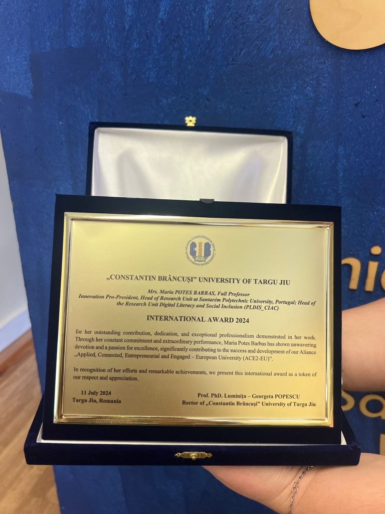 Maria Potes Barbas, Professora Coordenadora de Comunicação e Multimédia Educacional no Instituto Politécnico de Santarém, foi distinguida com o International Award 2024 pela Universidade “Constantin Brâncuși” de Targu Jiu, na Roménia.
