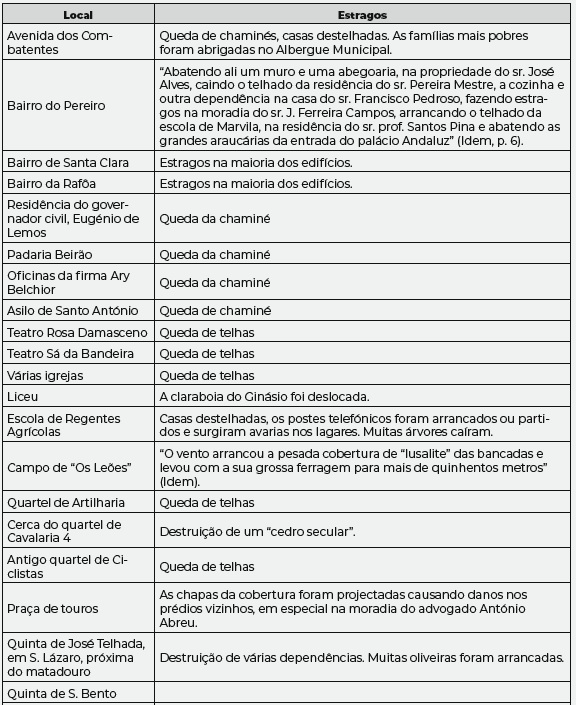 Os estragos na cidade de Santarém e nos arrabaldes foram avultados como se pode verificar pelo seguinte quadro: