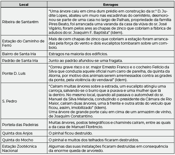 Santarém foi uma “cidade vergastada pelo ciclone, o redemoinhar da ventania brava (…) soprava por essas ruas, empurrado na sua frente os transeuntes, estilhaçando vidros, arrancando telhas, levando pelos ares chapas de zinco, fazendo desabar com medonho fragor empenas e chaminés. Vimos arrancar árvores dos jardins, estoirar os globos da iluminação pública, oscilar os postes telefónicos por essas ruas (…) rebolaram quiosques, caíram rebocos, as estradas e a linha férrea ficaram cortadas por gigantescos eucaliptos, cuja queda sepultou consigo vidas humanas” (Idem). As árvores derrubadas eram visíveis por toda a cidade e arrabaldes: calçada do Monte, Escola Agrícola, na quinta dos Anjos, nas passagens de nível do Vale de Santarém, junto à quinta da Comenda e em Vale de Lobos.