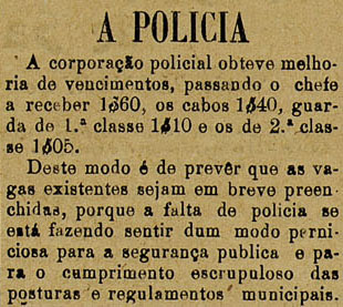 A corporação tinha falta de agentes a quem faltava instrução que consequentemente levava à indisciplina. Por outro lado, não existia, “positivamente um regular policiamento citadino” (Idem, p. 1). Em Setembro de 1919, a fim de conseguir que as vagas do corpo policial fossem preenchidas, os vencimentos foram melhorados, “passando o chefe a receber 1$60, os cabos 1$40, guarda de primeira classe 1$10 e os de 2.ª classe 1$05” (CE, 27/9/1919, p. 2). No entanto, os salários inferiores a outros do mercado de trabalho e o elevado analfabetismo limitavam a incorporação de novos agentes. Os relatos de fome entre alguns agentes também eram frequentes.