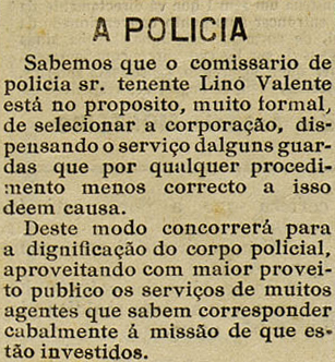 O problema subsistiu, pois em Dezembro de 1926, o comissário da polícia, tenente Lino Valente pretendia “selecionar a corporação, dispensando o serviço de alguns guardas que por qualquer procedimento menos correcto a isso deem causa. Deste modo concorrerá para a dignificação do corpo policial, aproveitando com maior proveito público os serviços de muitos agentes que sabem corresponder cabalmente à missão de que estão investidos” (CE, 11/12/1926, p. 2).