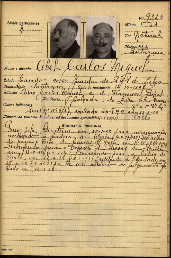 A 25 de Janeiro de 1938, o guarda da Polícia de Segurança Pública de Lisboa, Abel Carlos Miguel foi preso para averiguações pela Directoria da PVDE, no âmbito do processo n.º 1563/37. Enquanto aguardou o julgamento, percorreu três prisões: Aljube, de onde saiu a 15 de Março; Caxias onde ficou até 13 de Agosto e Peniche, onde se manteve até 22 de Outubro, data em que foi julgado e absolvido. Abel Carlos Miguel nasceu na travessa da Roda, 7, freguesia de Marvila, Santarém, a 12 de Outubro de 1887, sendo filho do pintor Adão Carlos Miguel, natural de Alpiarça e da doméstica Francisca Baptista, natural da Várzea, que se consorciaram em Alpiarça. Os seus avós paternos eram Francisco Miguel e Antónia Maria enquanto os maternos eram Joaquim Baptista e Angélica da Conceição. Abel Carlos Miguel foi baptizado na igreja de Marvila, a 29 de Janeiro de 1888, sendo apadrinhado pelos tios paternos, o professor José Carlos Miguel e a doméstica Maria dos Anjos, ambos solteiros. A 28 de Setembro de 1913, casou com Amélia de Seixas, na 4.ª Conservatória de Lisboa, fixando residência na calçada do Lavra, Vila Ferreira, 4, 1.º Dto, Lisboa.