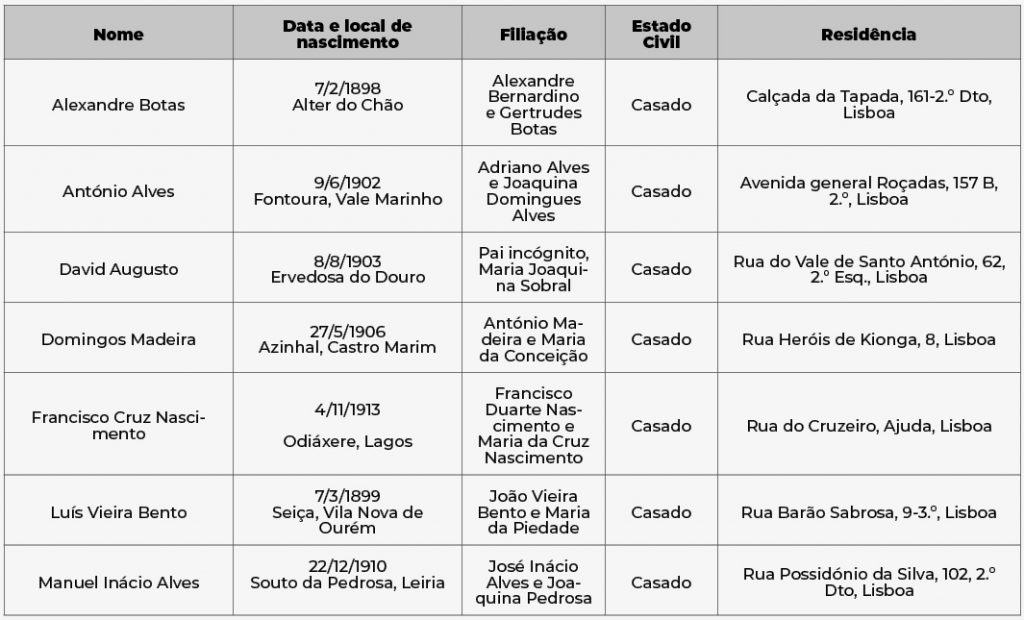 As excepções foram os guardas da Polícia de Segurança de Lisboa, Joaquim Zacarias e Manuel Francisco Candeias. Joaquim Zacarias nasceu a 3 de Novembro de 1904, em Alcácer do Sal, filho de António Pedro de Carvalho e Maria Adelaide Augusta Zacarias. Quando foi preso, a 4 de Novembro de 1937, pelo Comando da Polícia de Lisboa, era solteiro e residia na Rua do S. João da Praça, 77, 1.º Dto, Lisboa. A sua prisão para averiguações inseria-se no processo n.º 1570/37 equivalente ao processo de 1563/37.