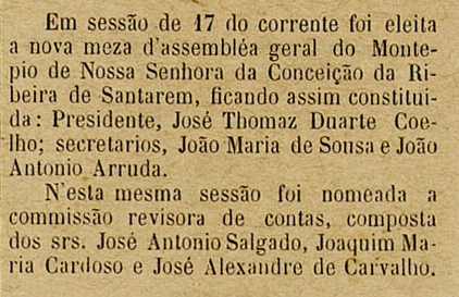 Os estatutos do Monte-pio Ribeirense foram revistos, a partir da organização do sócio José Tomás Duarte Coelho e publicados na tipografia do escalabitano Bernardino Santos, em 1896. No ano seguinte, foram eleitos dirigentes José Franco das Neves (presidente), Joaquim Maria da Costa Malfeito (tesoureiro) e Augusto César da Costa (secretário). Em 1900, os corpos gerentes eram constituídos por Joaquim Maria Cardoso (presidente), António César Marques (tesoureiro), Augusto César da Costa (secretário), Joaquim Faustino Duarte, José Dias Picoto, Henrique Nunes da Conceição, José Maria Ferreira Benfeito (vogais). O presidente da assembleia-geral era Joaquim da Costa Malfeito, cargo que acumulava com a presidência do conselho fiscal, sendo secretariado por Alfredo Júlio Cravador e Francisco Cardoso da Silva.