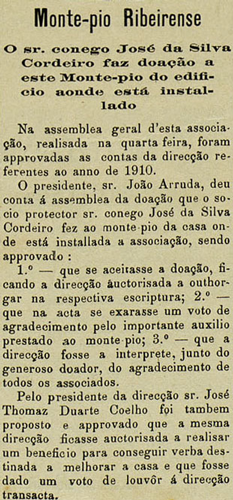 Em Março de 1902, o cónego José da Silva Cordeiro doou ao Monte-pio a sua casa e o quintal na rua de Santo António, onde se encontrava instalada a associação. Esta “como manifestação de reconhecimento por tão valiosa oferta, vai fazer uma sessão solene colocando por essa ocasião o retrato do doador na sala das suas sessões” (CE, 5/4/1902, p. 2). O Monte-pio só tomou posse do imóvel na assembleia-geral de 15 de Fevereiro de 1911, presidida por João Arruda. Nessa sessão, também foi aprovada a proposta do presidente da direcção, José Tomás Duarte Coelho para “realizar um benefício para conseguir verba destinada a melhorar a casa” (CE, 18/2/1911, p. 2).