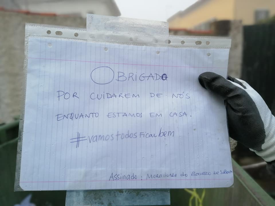 Os moradores deixaram mensagens de força aos profissionais nos pontos de recolha do Bairro. “Obrigado por cuidarem de nós enquanto estamos em casa. #vamostodosficarbem”, podia ler-se num dos contentores.