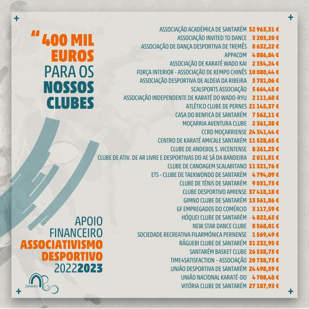 A Câmara de Santarém vai atribuir apoios financeiros, no âmbito do Regulamento de Apoio e Financiamento ao Associativismo Desportivo (RAFAD) – Programa de Apoio à Formação Desportiva – Atividade Regular, a 31 clubes e associações desportivas de várias modalidades com sede no Concelho, num valor global de 400 mil euros.