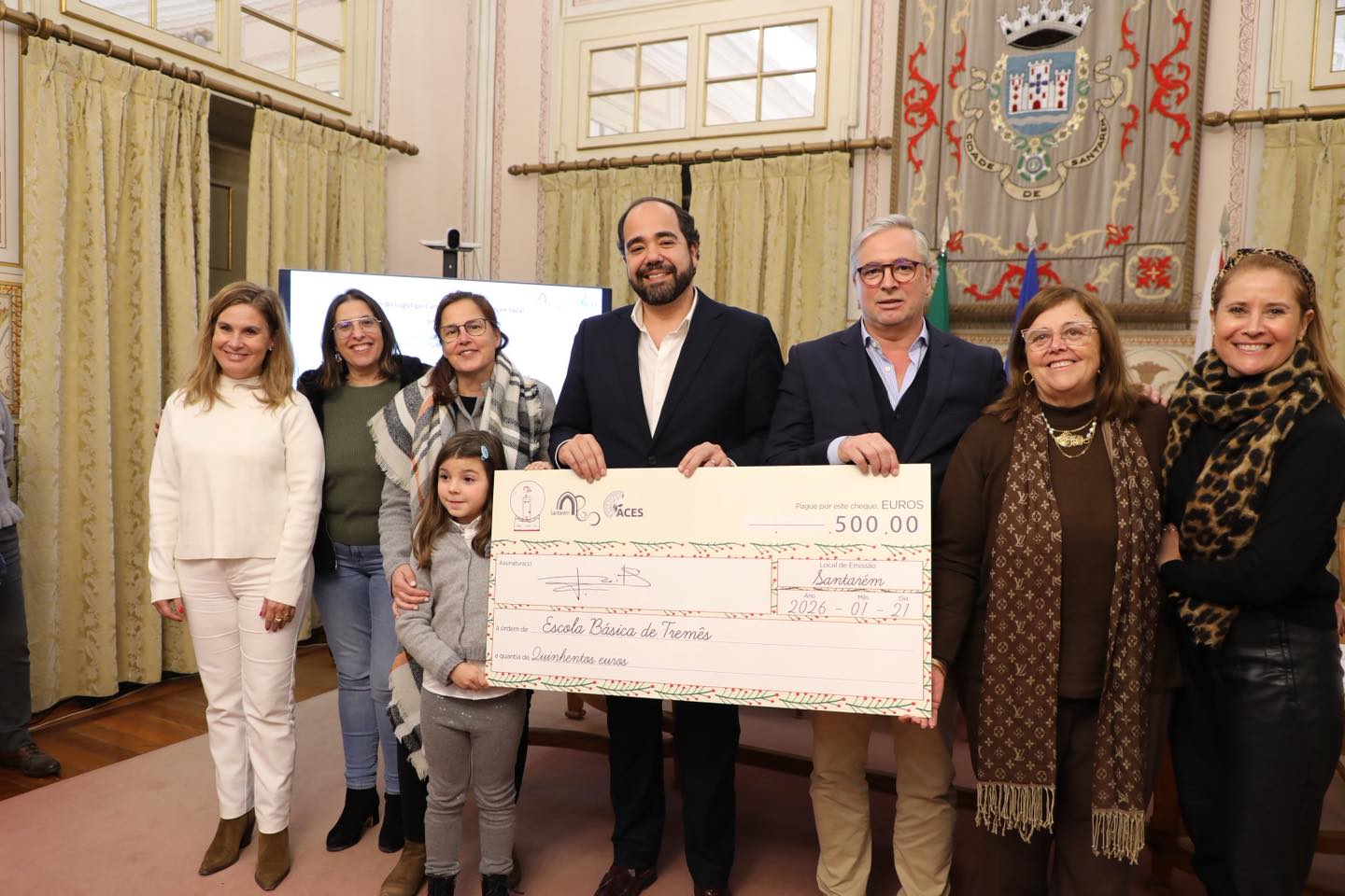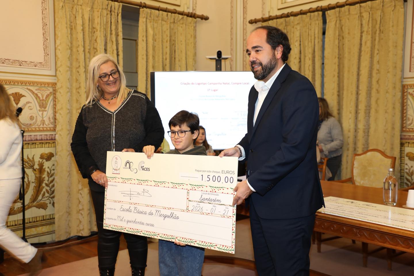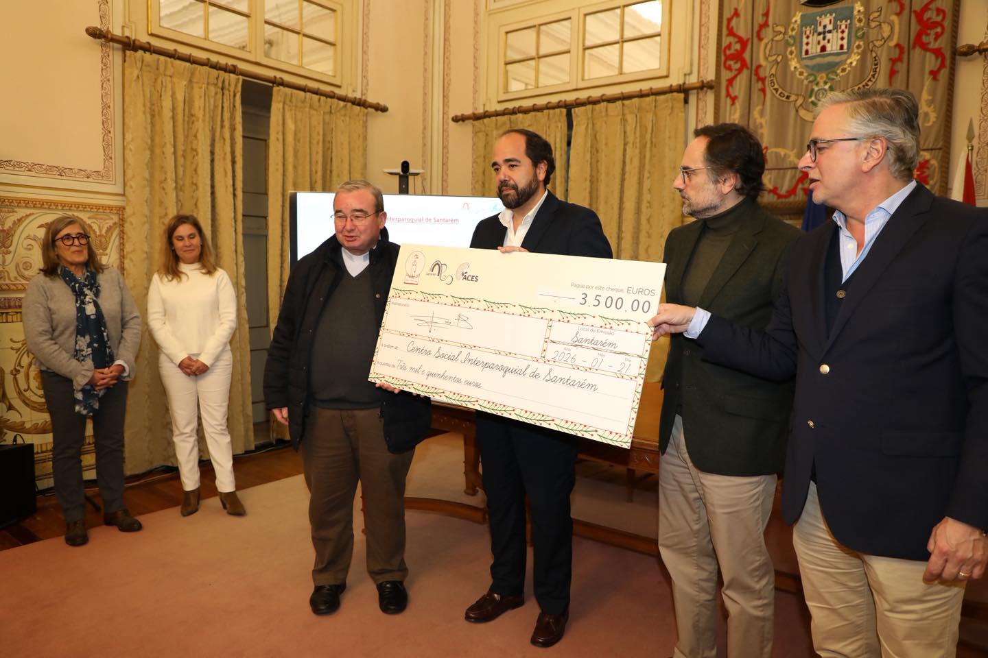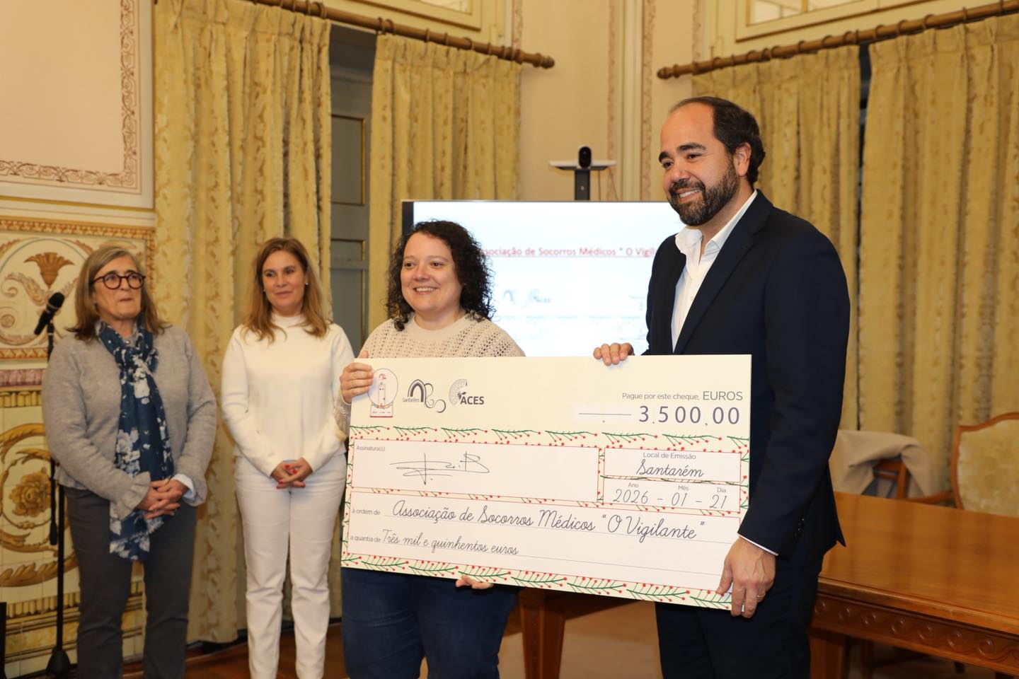 João Teixeira Leite, Presidente da Câmara Municipal de Santarém procedeu à entrega dos cheques que decorreu no Salão Nobre dos Paços do Concelho, acompanhado por Maria Elisabete Filipe, Chefe de Divisão de Ação Social e Saúde, Susana Martinho, Chefe de Divisão de Desenvolvimento Económico, e Vânia Horta, Chefe de Divisão de Educação e Juventude.