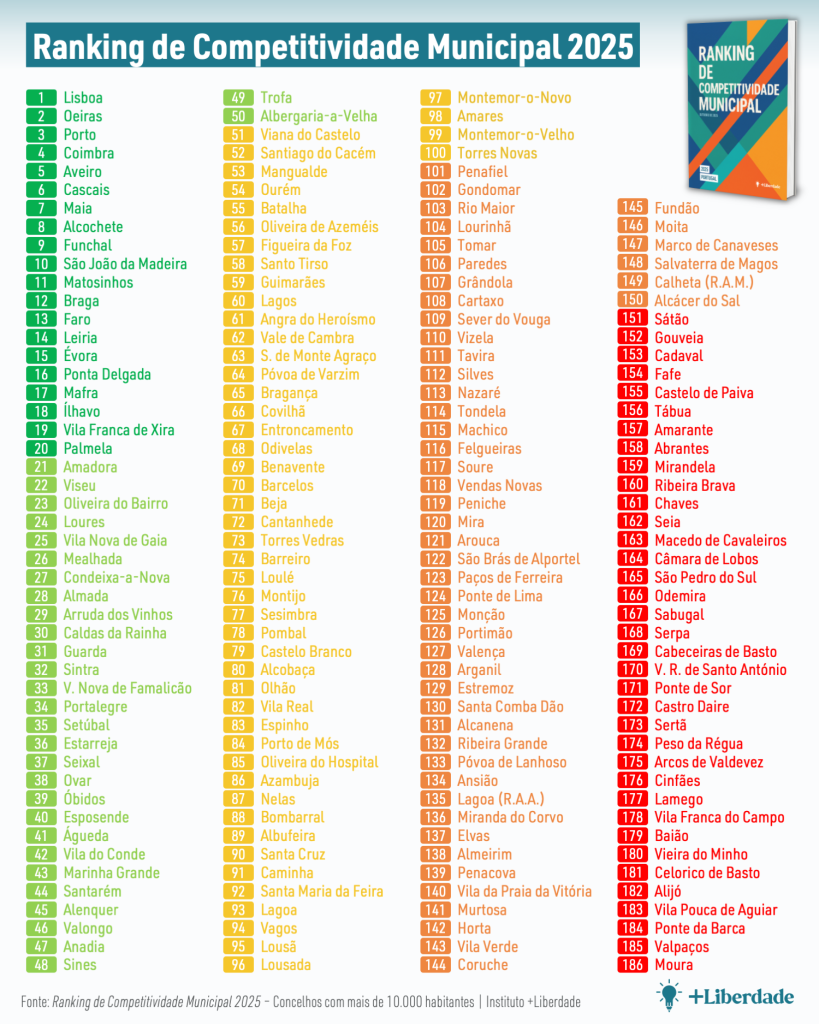 Lançado a poucos dias das eleições autárquicas, o ranking avalia os 186 municípios portugueses com mais de 10 mil habitantes, representando 94% da população portuguesa.