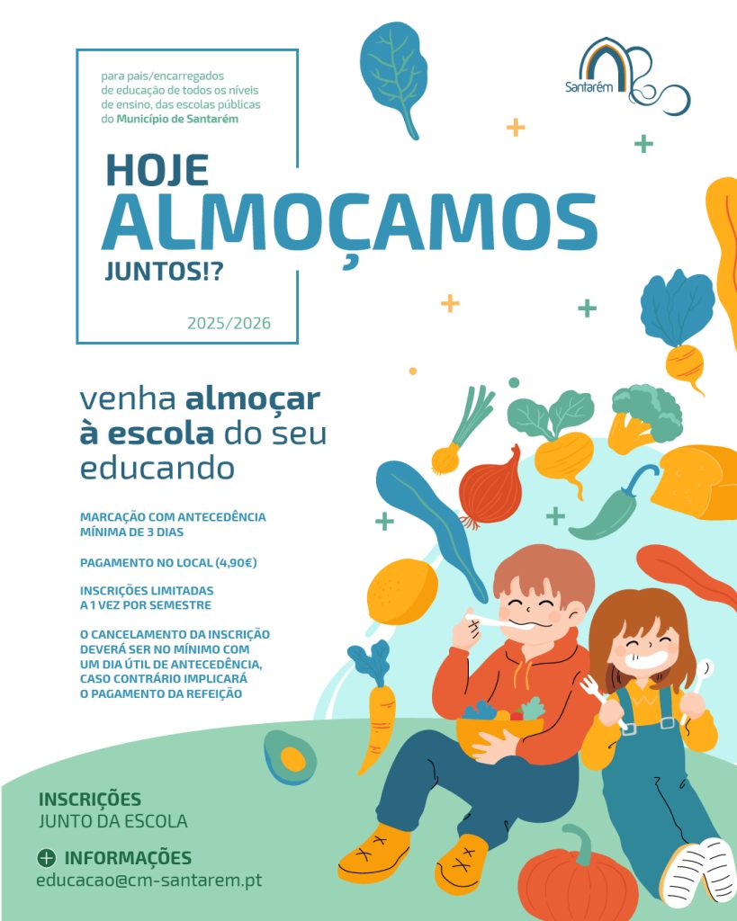 O Município de Santarém volta a promover no ano letivo escolar de 2025/2026, o projeto “Hoje Almoçamos Juntos”, que convida os encarregados de educação a partilharem uma refeição na escola com os seus educandos.