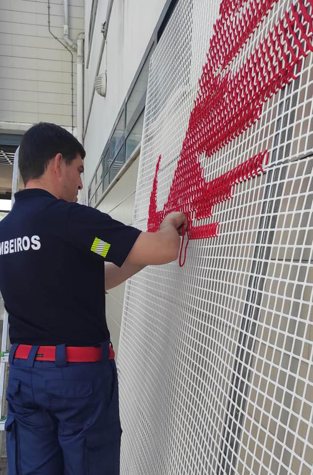Um mural de 3 por 7 metros assinala, numa das paredes do quartel dos Bombeiros Voluntários de Santarém, a passagem dos 150 anos da corporação. A obra de arte urbana foi elaborada com a técnica de ponto cruz pelo bombeiro voluntário Bruno Madeira, oficial da Marinha profissionalmente, e artesão.