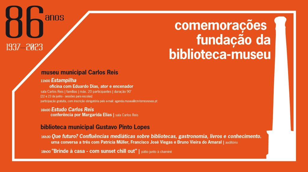 Para sábado está agendada a oficina “Estampilha”, de Eduardo Dias, ator e encenador, que parte da correspondência de Carlos Reis para desafiar à escrita e troca de cartas e, à tarde, a conferência “Que futuro? Confluências mediáticas sobre bibliotecas, gastronomia, livros e conhecimento”, com Patrícia Muller, Francisco José Viegas e Bruno Vieira do Amaral.